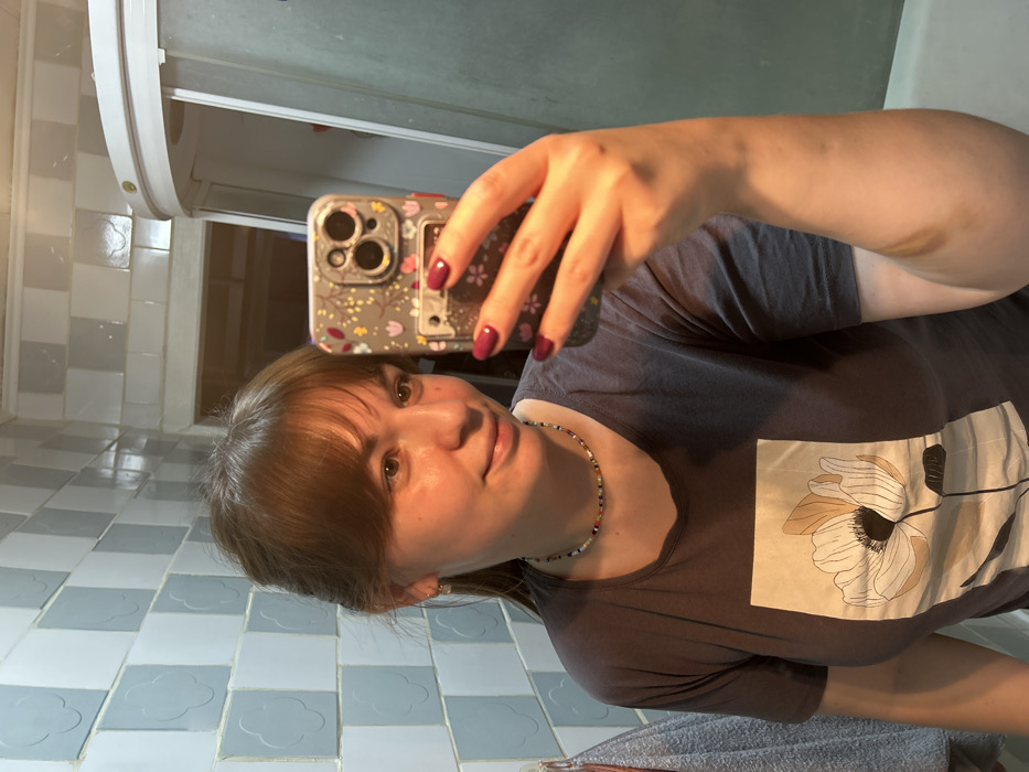 A female, appearing to be in her 20s or 30s, is depicted taking a mirror selfie in what is identified as a bathroom. The specific location in the city of Фоки, Russia, cannot be determined from the visual evidence within the image. The subject has light skin, brown hair styled with bangs and pulled back, and brown eyes. She wears small stud earrings and a multicolored beaded choker necklace. Her attire consists of a dark grey short-sleeved t-shirt featuring a light-colored graphic print of a flower, possibly an anemone or poppy, on the chest. Her right hand, adorned with dark red nail polish, holds a smartphone encased in a gray floral-patterned case with triple camera lenses visible. The phone is positioned to capture her reflection. Her expression is a slight smile. The environment features tiled walls composed of alternating light blue and white square tiles, some exhibiting a subtle raised quatrefoil pattern. A white border trim runs along the top of the tiled section. To the right, a portion of a white, curved shower cabin or enclosure is visible. On the left side of the frame, a dark-colored towel hangs on a fixture. Overhead, the top of a door frame or opening suggests an adjacent darkened room. The lighting appears artificial.