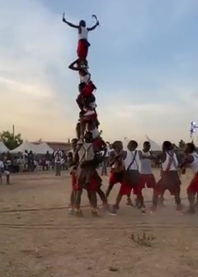 In an outdoor setting under a lightly clouded sky, a group of approximately twenty people stand in a circle, with about ten forming a human tower. The tower is composed of individuals stacked vertically, with the topmost person standing arms raised. The people wear white shirts and red shorts, with some on the ground also donning brown raffia skirts. They hold onto each other to maintain balance. They perform to the sound of a drumbeat and chant. The setting appears to be a field or open space with tents and audience members visible in the background, along with a sound system. The ground is dusty or sandy, and the overall atmosphere is festive.
