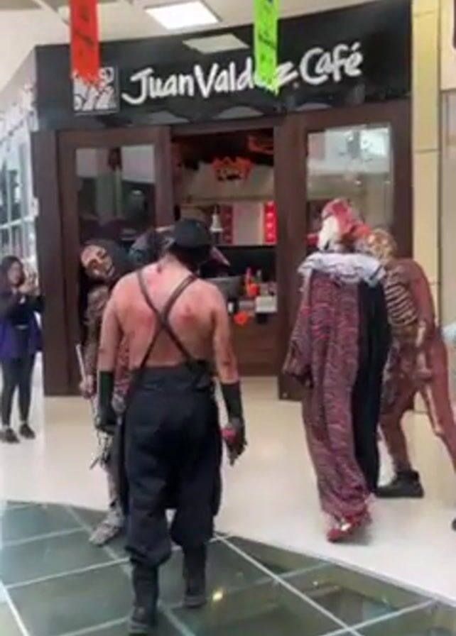 group of individuals in Halloween costumes walking through what appears to be a shopping mall. There is a Juan Valdez Café in the background, decorated with Halloween banners. The costumes include a clown, a zombie, a bloody nurse, and a bare-chested man with a mask. The group walks over a glass floor with a grid pattern. The video captures the event, showing people reacting to the costumed figures. A person dressed as a character covered in restraints and wearing a mask briefly poses for the camera.