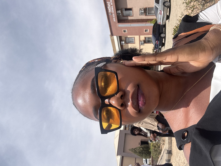 A dark-skinned female is depicted in a sunlit outdoor close-up, likely a selfie, in Jos, Nigeria
