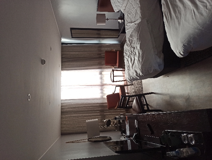The bedroom features two beds with white linens. Two orange chairs flank a window covered by neutral-toned drapes. A desk, stocked with a glass tray, sits in the foreground. The desk's surface has miscellaneous items and a reflective quality. A wall lamp sits near the beds. The room's color palette is neutral.