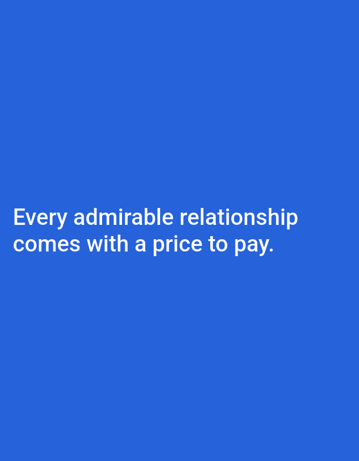 The image is a solid blue background with white text centered in the lower half of the frame. The text reads: "Every admirable relationship comes with a price to pay." The overall composition is simple, with a focus on the message conveyed by the text. The blue background provides a stark contrast to the white lettering.