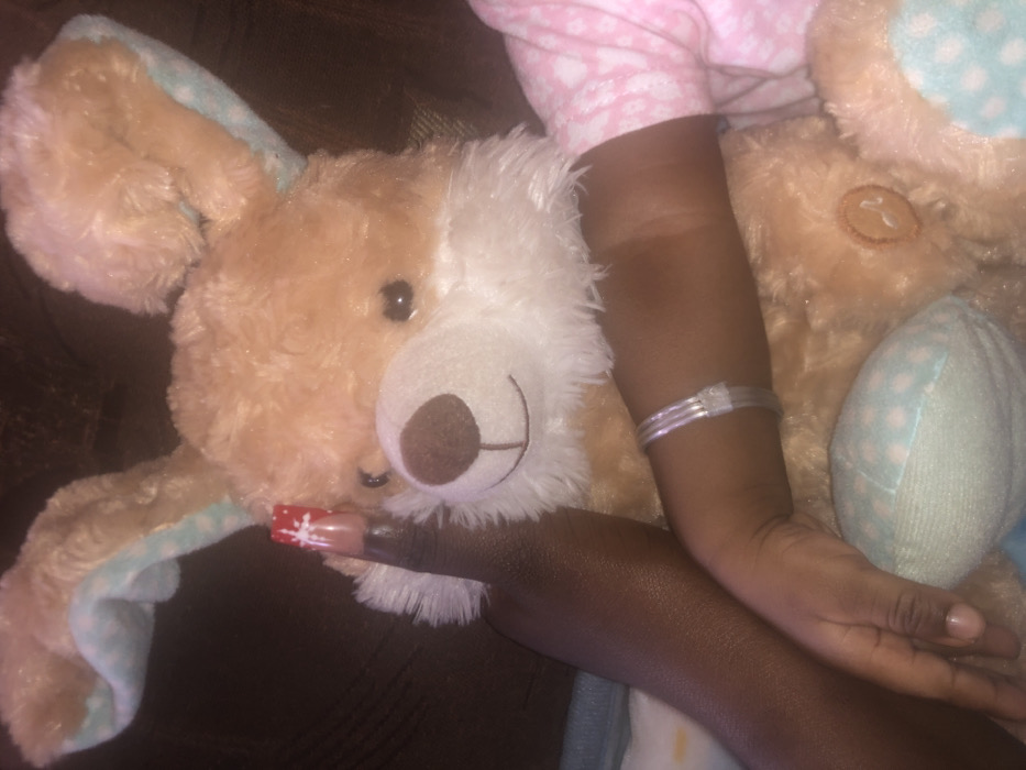 The scene, located in Rido, Nigeria, depicts a partial view of a dark-skinned individual's left arm and hand embracing a large, light brown stuffed animal
