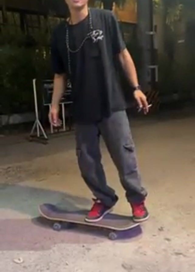 slender person with dark hair, dressed in dark clothing and red sneakers, standing on a skateboard outdoors at night. The person, who appears to be male, smiles, takes a drag from a cigarette, and then bends down to place his hands on the skateboard. The background includes a paved surface, a building, vegetation, and a sign. The lighting is dim.