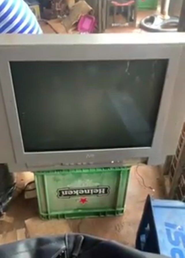 A JVC CRT television sits on a green Heineken crate, with a blinking light indicating it's on