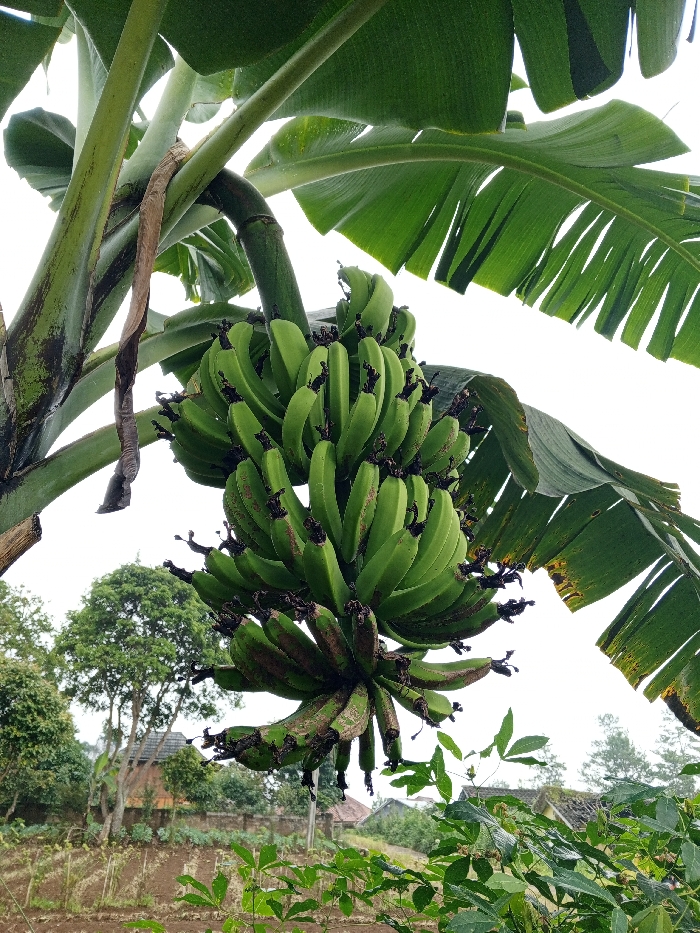 A banana tree bearing a large cluster of green bananas is the main subject. The bananas are unripe and densely packed together. Lush green leaves of the banana tree surround the fruit. In the background, other trees, vegetation, and glimpses of buildings suggest a rural or agricultural setting. The foreground shows other plants, possibly crops, adding depth to the scene. Overall, the image captures a thriving tropical or subtropical landscape.