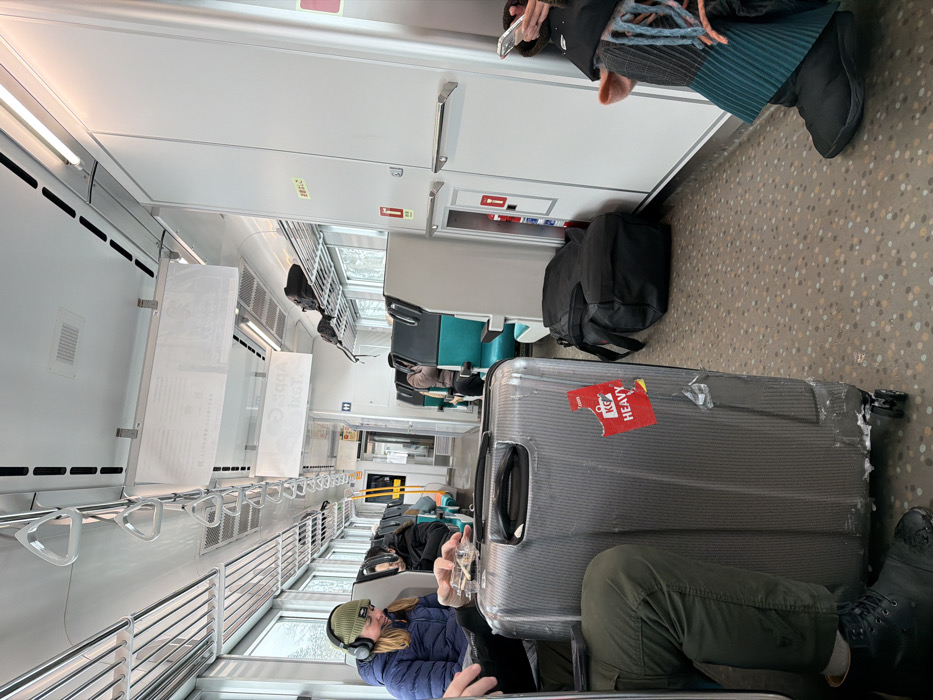 Inside a train car, passengers sit with luggage. Overhead compartments line one side of the train. A large, gray suitcase with a red "Heavy" sticker occupies a significant portion of the aisle. Other luggage pieces, including a black backpack, are nearby. People are seated, with one person wearing headphones and another appearing to use a phone. The train car appears to be modern, with teal and gray seats. Exterior snow is visible through the windows.