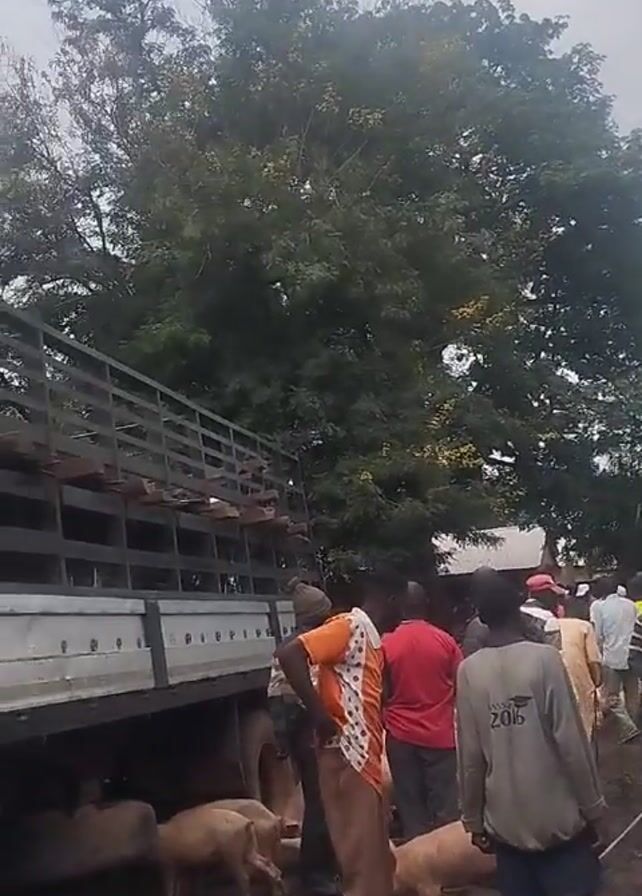 muddy area with a group of people and several pigs. The pigs are light pink in color and appear to be moving around in the mud. Some of the people are standing near the pigs, while others are near a truck with a metal cage-like structure on its bed. The people seem to be interacting with the pigs, possibly herding them or loading them onto the truck. The environment is outdoors, with trees and overcast sky in the background. The ground is covered in mud, suggesting it may have recently rained.