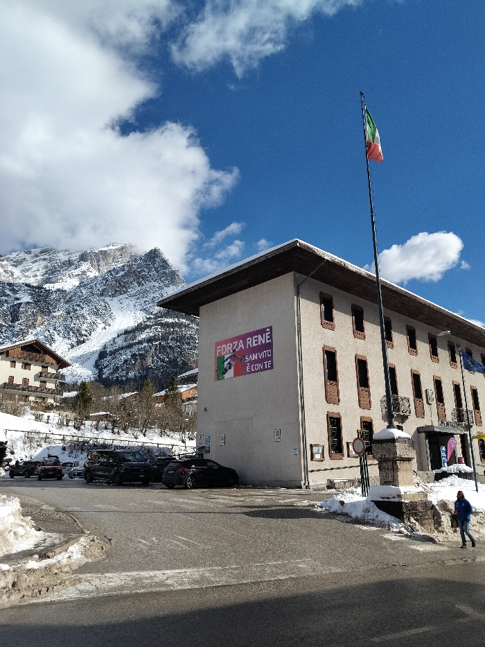 The image depicts a winter scene in a mountainous region, specifically in Serdes, Italy. A multi-story, light-colored building with dark-framed rectangular windows occupies the right side of the frame. An Italian flag flies from a tall pole in front of this building. On the building's left facade, a large banner displays "FORZA RENÉ" above an Italian flag graphic, with the text "SAN VITO È CON TE" below. The ground in front of the building consists of a partially snow-covered paved area functioning as a parking lot, where several dark-colored vehicles, including SUVs and sedans, are parked. A single individual, wearing a blue jacket, walks on a snow-lined sidewalk on the far right. In the background, prominent snow-capped mountains rise under a clear blue sky dotted with white clouds. Other chalet-style buildings are visible on a snow-covered hillside to the left of the main building. Patches of snow and bare ground are present on the roads and surrounding areas.