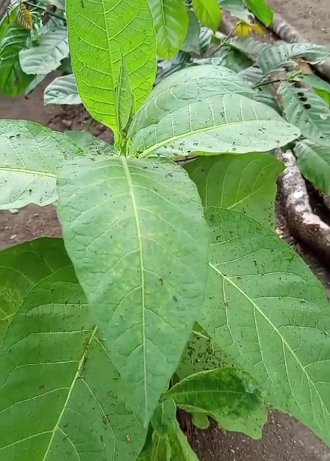 A close-up shot shows a green tobacco plant growing in the ground, in a garden or outdoor setting
