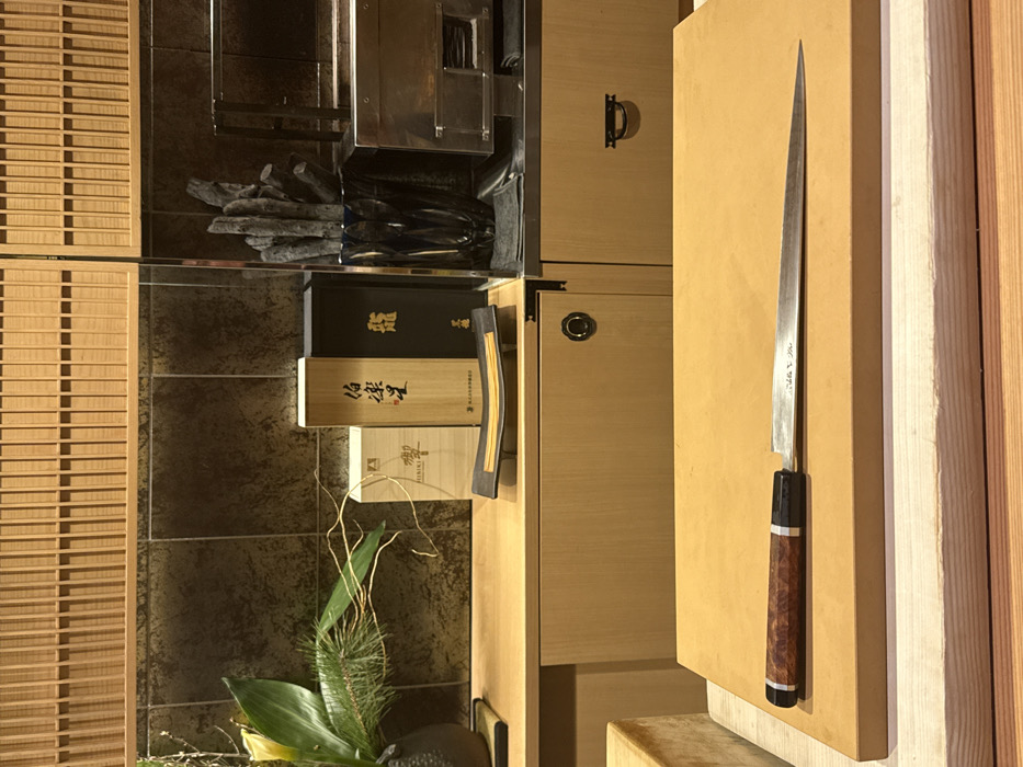 A slender Japanese kitchen knife with a dark handle hangs on a light wood board. Behind it, a series of wooden cabinets feature simple hardware. A glass shelf displays kitchen tools and wooden boxes with Japanese characters, illuminated by soft light. A small floral arrangement with green leaves and pine needles sits at the bottom of the frame. A slatted wooden wall is visible on the left.