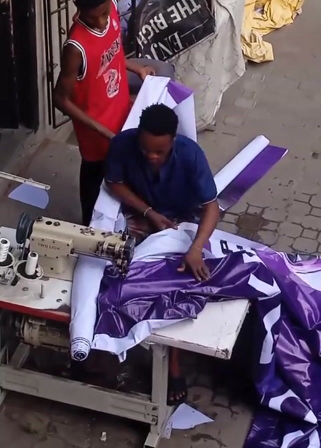 Two men are outside, with one operating a "Two Lion" brand sewing machine. The man at the machine is seated, wearing a dark blue shirt and sandals, and he is sewing together pieces of white and purple fabric. The other man, wearing a red basketball jersey with the number 24 on it, stands behind him, holding up a portion of the fabric. The area is outdoors, near what appears to be a building or fence. There are other items nearby, including a black shopping bag with text that includes the word "ENJOY", a yellow tarp, and some white paper scraps on the table.