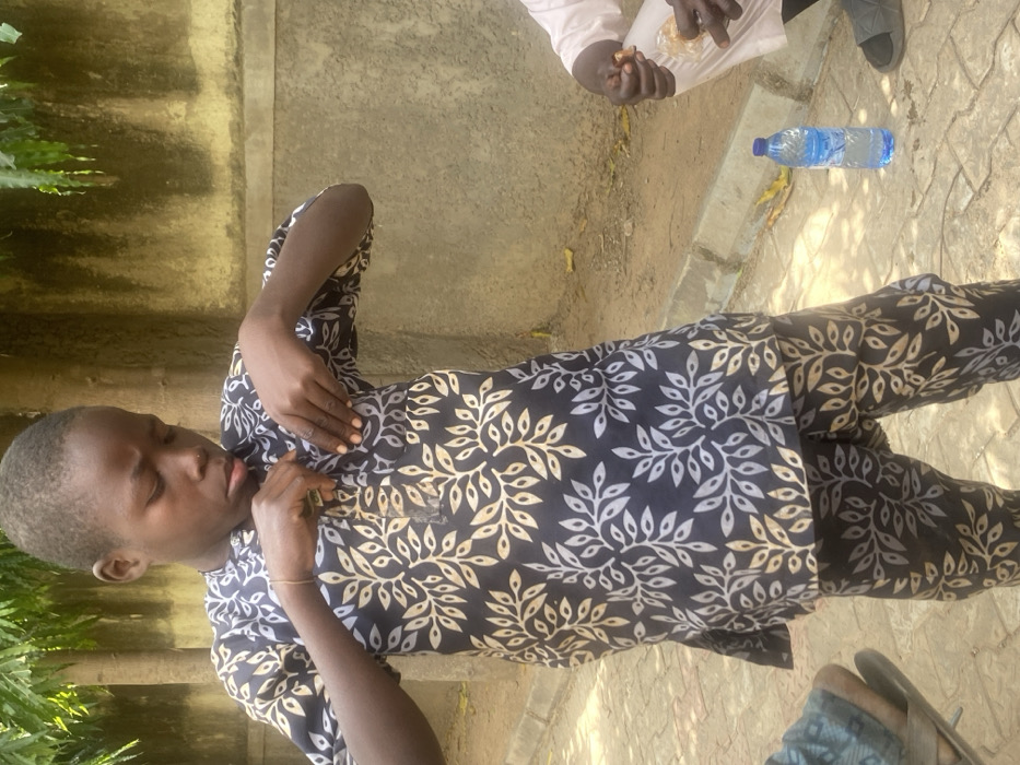 The image depicts an outdoor scene in Rigasa, Nigeria, featuring a young male and parts of two other individuals