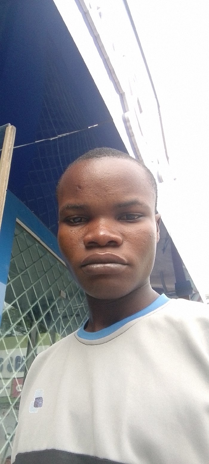 A young man with dark skin, short dark hair, and a neutral expression faces directly towards the camera in a close-up, chest-up shot
