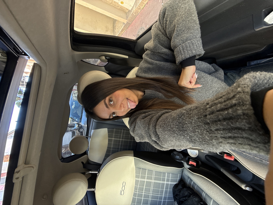 A young adult female takes a selfie from the driver's seat of a stationary white and grey Fiat 500 in Cannes, France