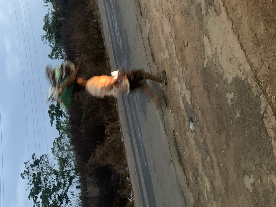 A blurry image depicts a person walking alongside a road. They carry a large bundle on their head, possibly wrapped in green material. The individual is wearing an orange top and dark bottoms. Vegetation lines the side of the road, with trees visible in the background against a pale sky. The pavement is cracked and uneven. The overall impression is one of movement and rural poverty.