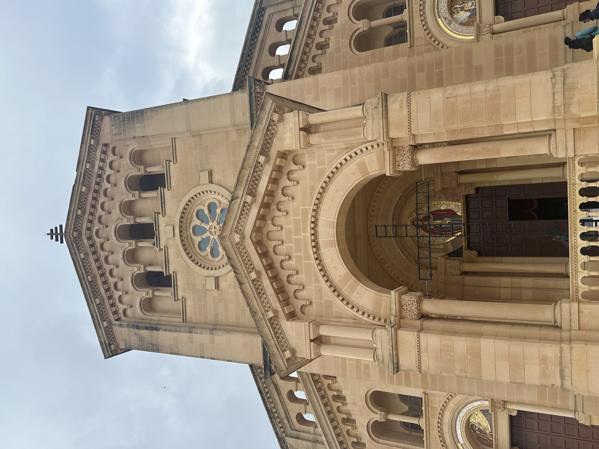 An exterior, low-angle photograph depicts the facade of the Sanctuary of Our Lady of Ta' Pinu in Għarb, Gozo, Malta, under an overcast sky. The structure is built from light beige, rectangular cut stone blocks, exhibiting a predominantly Romanesque Revival architectural style. The central elevation features a prominent arched main entrance with dark brown double doors, flanked by two engaged columns with carved capitals. Above this arch, a recessed mosaic depicts a robed religious figure, over which a dark metal crucifix is suspended vertically. Higher on the central tower, a large circular rose window with blue and clear glass segments is visible, surmounted by a row of five smaller arched openings. A small, dark cross finial caps the uppermost stepped gable. Flanking the central section are two recessed side entrances, each with dark brown double doors and topped by semicircular mosaics. A low, ornate stone balustrade extends horizontally across the lower foreground, partially obscuring the base of the facade. A metallic ladder or scaffolding structure is positioned behind the balustrade, to the right of the main entrance. Two individuals are visible on the right side of the balustrade: one person is seen from the back, wearing a light blue jacket and carrying a dark backpack; the other, partially obscured, is dressed in dark attire. A third, less distinct dark figure is present within the shadows of the main entrance.