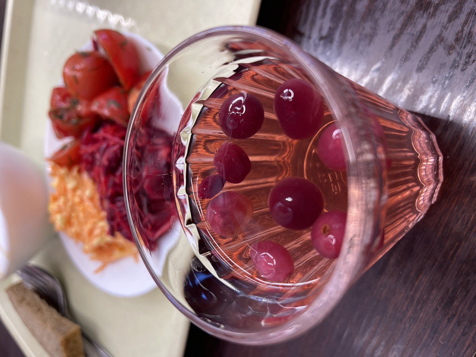 The scene depicts a meal set on a dark, textured tabletop in Chaikovsky, Russia. In the immediate foreground, a clear, faceted glass holds a pink liquid with several dark red, spherical berries (consistent with cranberries or lingonberries) floating within it. The glass is in sharp focus. Beyond the glass, on a light beige serving tray, a white plate is visible, containing three distinct portions of food: shredded orange vegetables (likely carrots), shredded dark red vegetables (likely beets), and cut red tomatoes, possibly seasoned with green herbs. To the left of the plate, a small white bowl contains a white, semi-liquid substance. Further left, a piece of dark bread and a silver fork rest on the tray. No individuals are present. The background elements on the tray are intentionally out of focus, while the glass and its contents are precisely rendered.