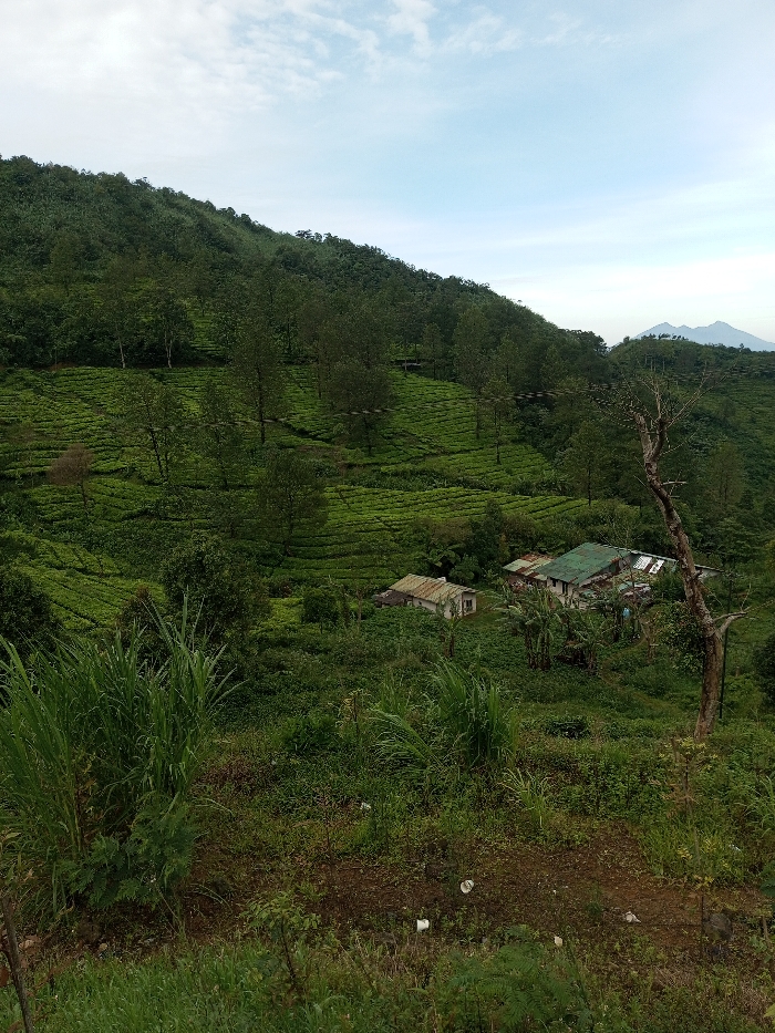 Lush green hillside with terraced tea plantations under a partly cloudy sky. Several small buildings with metal roofs are nestled among the trees. The foreground features tall grasses and dense vegetation. A bare tree stands to the right. Distant mountains are visible on the horizon. The overall scene depicts a rural, hilly landscape with agriculture and simple dwellings.