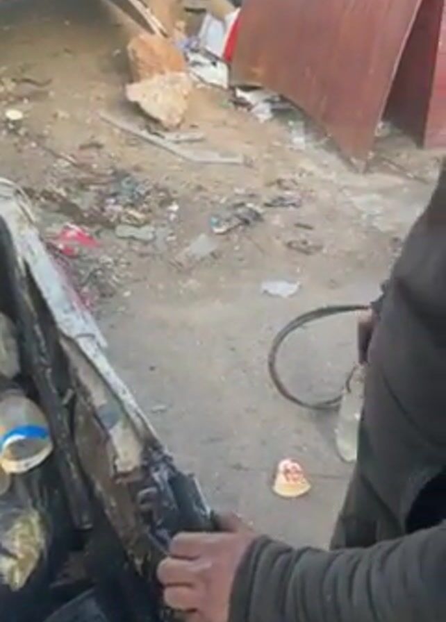In a medium shot, a man stands near a car trunk in what appears to be a junkyard. The trunk is open, and the man is manipulating a black object within the car. The trunk interior is cluttered with items including tires, bottles, and bags. The junkyard is filled with scrap metal, debris, and discarded objects. In the background, a white car is visible behind a wall. The man is wearing a dark-colored hooded sweatshirt and has a beard. His focus is on the object he is handling within the trunk, and he briefly looks up. The overall environment suggests a setting of disrepair and salvage operations.