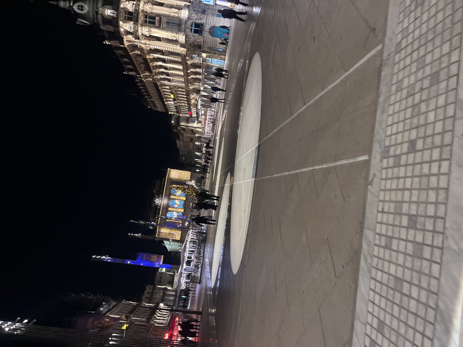 A nighttime cityscape view, possibly a European plaza. Illuminated buildings with intricate architecture line one side, filled with pedestrians. The open square features large, circular, illuminated patterns on the ground. In the distance, a blue-lit tower stands. A grid-like pattern is seen in the lower right corner of the image. Overall, the scene captures a vibrant, urban environment.
