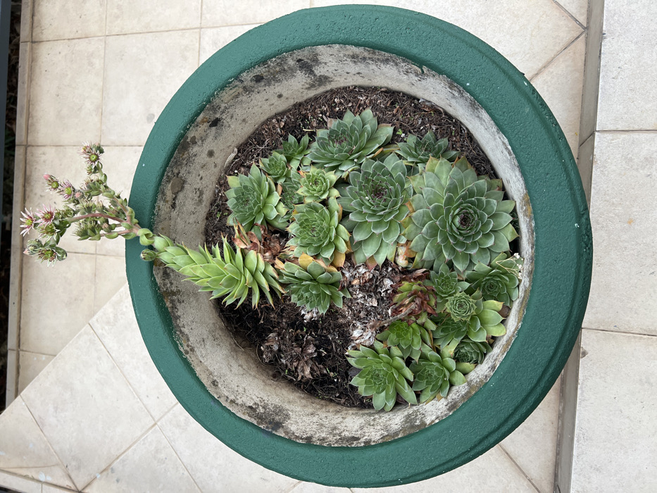 The scene depicts a circular concrete planter located in Sutomore, Montenegro, viewed from a high-angle, top-down perspective. The planter's exterior rim is painted a matte dark green, contrasting with its unpainted, weathered gray concrete interior walls. It contains dark brown soil. Multiple green succulent plants, identified as Sempervivum, are present, forming rosettes of varying sizes. A prominent plant in the upper-left features a thick, segmented stalk extending upwards and to the right, which branches into smaller stems topped with clusters of small, pale pink and white flowers or buds. Scattered dried, brownish plant matter is visible among the living succulents. The planter rests on a light-colored tiled surface with discernible grout lines. No people or animals are present.