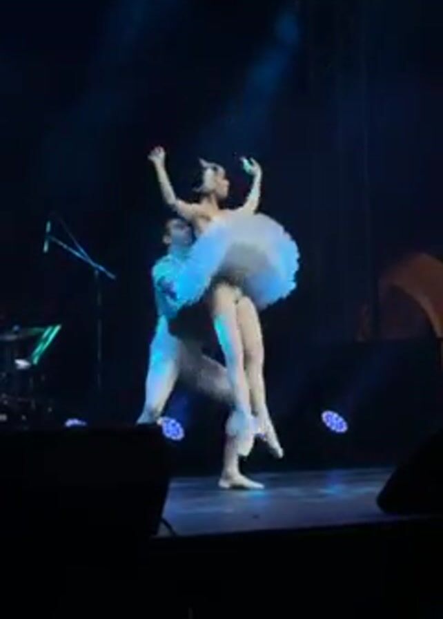 On a stage bathed in blue light, a ballet performance unfolds. A male dancer, clad in white tights and a silver and white top, supports a female dancer, dressed in a white tutu and headdress. They execute several graceful movements, including lifts and turns. In the background, stage equipment such as microphones and speakers are visible, suggesting a larger production. The overall impression is one of elegance and theatrical artistry.