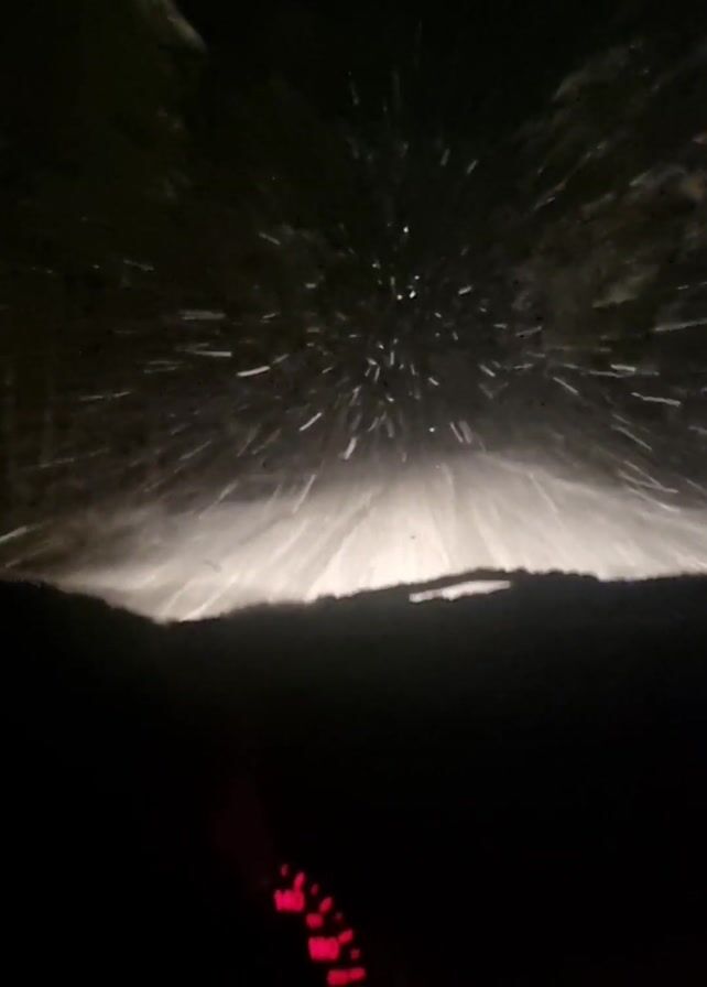 first-person perspective from inside a car driving at night during heavy snowfall