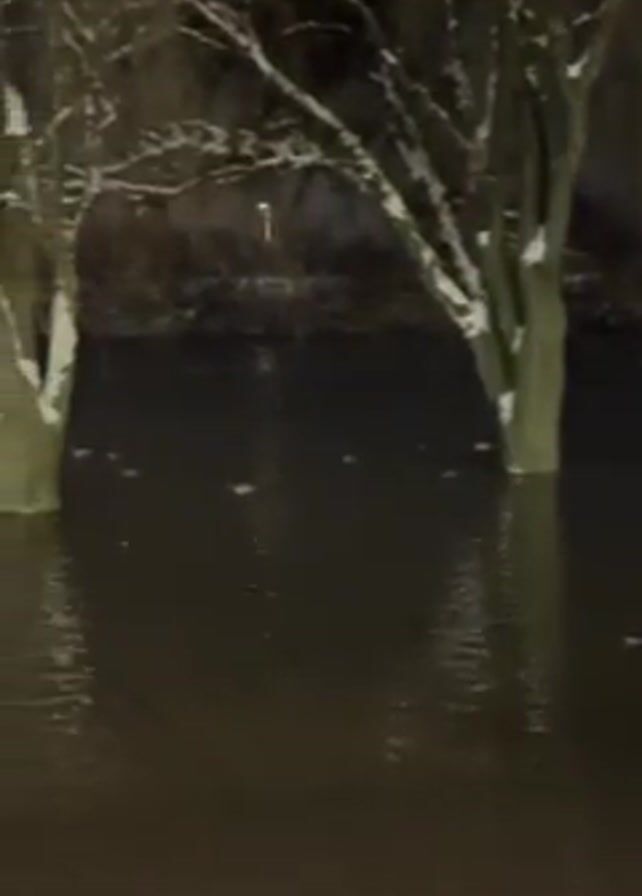 flooded area at night. The water is dark and murky, and the trunks of trees are submerged. The branches of the trees are covered in snow. A street lamp can be seen in the background, its light reflecting on the water.
