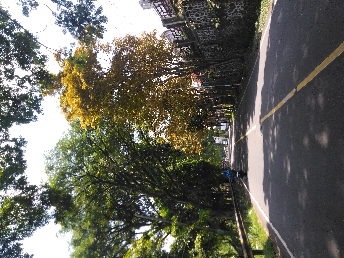 The image displays a paved road in Cugenang, Indonesia, viewed from a low angle, extending into the distance. The dark asphalt road features a continuous yellow center line and white edge lines. On the left side, a silver-colored metal guardrail with a yellow top edge runs parallel to the road, bordered by green vegetation. On the right side, a textured stone wall, topped with a dark, decorative metal fence, parallels the road. Dense green trees line the left side, forming a partial canopy, while the right side features a prominent tree with yellow-gold foliage amidst other green trees. The bright sky is visible through gaps in the overhead tree canopy, which casts irregular shadows across the road surface. A single dark-colored motorcycle, operated by an individual wearing blue clothing, is observed in the left lane, proceeding away from the camera. Additional indistinct vehicles are visible further down the road.