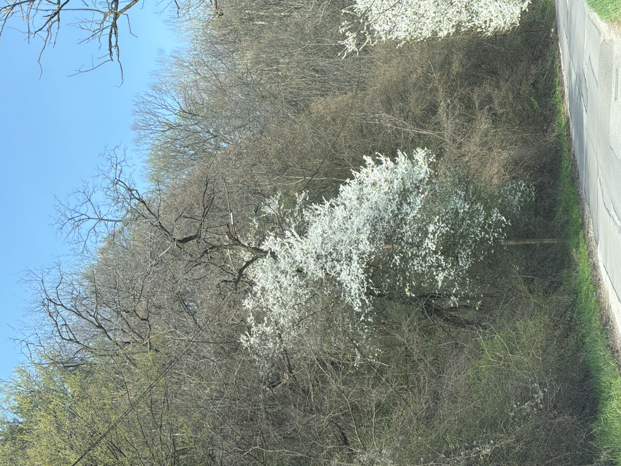 roadside scene with trees in varying states of foliage. Some trees are bare, while others are in bloom with white flowers. A paved road with a green grassy edge is visible on the right side. The sky is light blue. The location, if in Vladaya, Bulgaria, is likely a rural or semi-rural area with natural vegetation alongside a road.