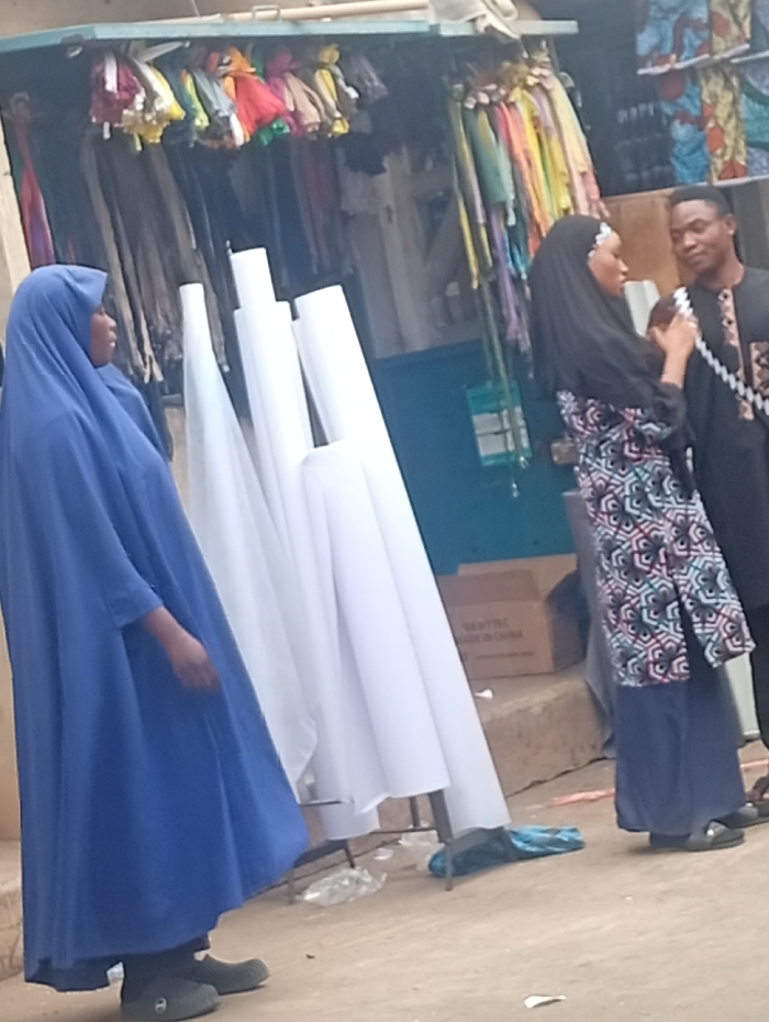Two women in traditional Muslim dress stand on a street. One woman wears a long, flowing blue garment with a hood, while the other sports a patterned top and a dark headscarf. They stand near a display of white fabric rolls. A man in a patterned shirt stands to their right. A shop hangs overhead with colorful textiles.