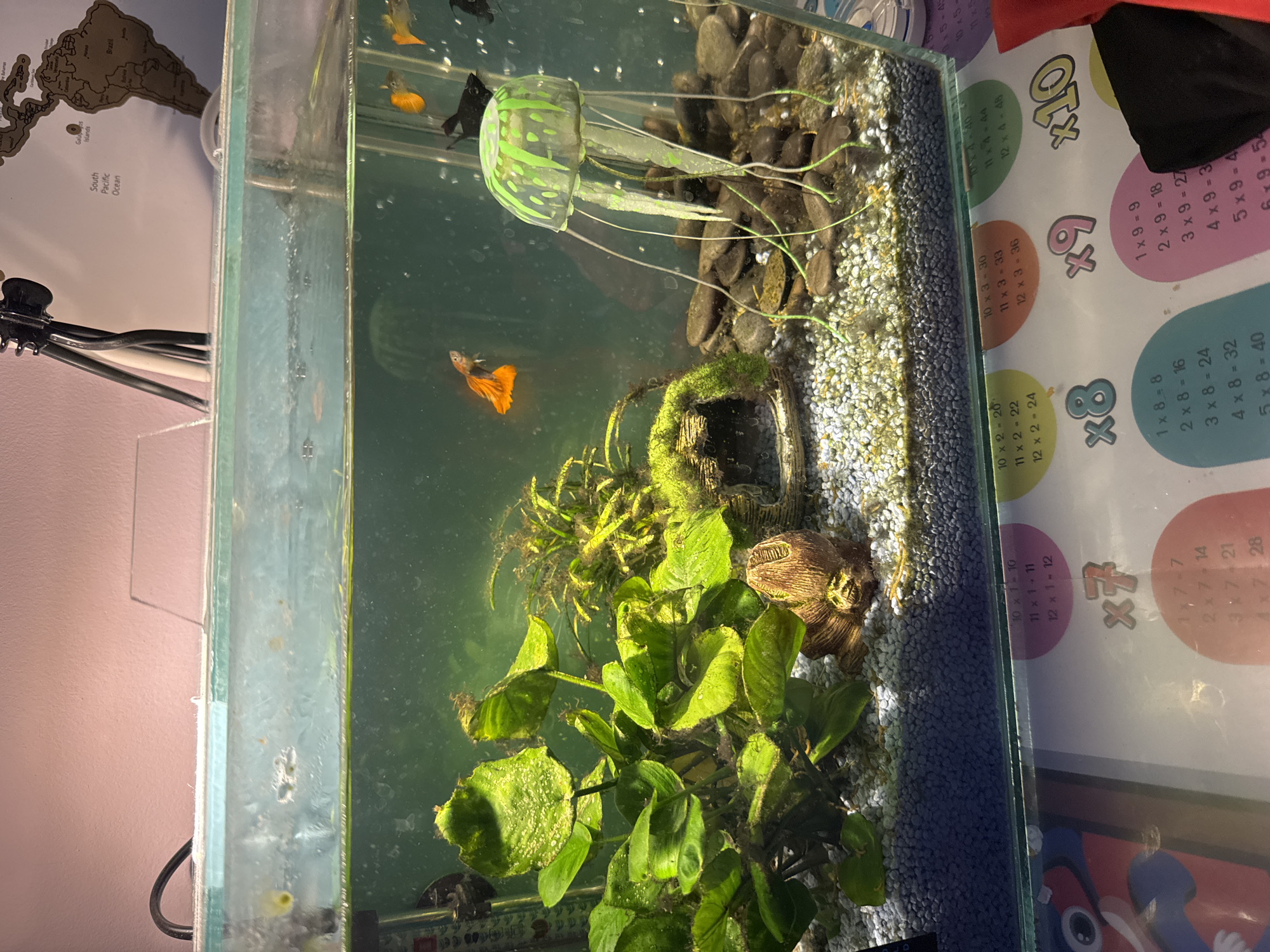 The image displays a rectangular glass aquarium positioned on a colorful laminated educational mat. The aquarium contains greenish-tinted water with several small fish identified as guppies, exhibiting orange, black, and dark coloration. Within the aquarium, live aquatic plants with broad green leaves are clustered on the left, displaying some white speckling on their surfaces, consistent with mineral deposits or algae. Finer, lighter green aquatic plants are visible in the mid-background. The substrate consists of light-colored, small gravel in the foreground, transitioning to a darker, finer gravel beneath. Decorative elements include a brown, textured ornament resembling a submerged log or rock formation on the left side, and a separate section of dark, smooth river stones on the right. An artificial jellyfish decoration, featuring a translucent green domed cap with white and green trailing tentacles, is situated on the right side above the dark stones. A black submersible heater is partially visible on the far left. Air bubbles are present within the water column. Above the water line, a glass lid partially covers the top of the tank. The water level is slightly below the rim. Against the background is a pale pink wall. A black electrical cable and a portion of a light fixture are visible in the upper left. To the upper right, a light-colored map with brown outlines is visible, showing parts of South America, including text labels for "Brazil," "South Pacific Ocean," and "Galapagos Islands." Below the aquarium, the multicolored laminated mat displays multiplication tables, including sections for "x7," "x8," "x9," and "x10," with associated equations. A dark fabric object is visible in the lower right corner, extending partially onto the mat. The location in the city of Varna, Bulgaria, cannot be visually confirmed from the provided image data.