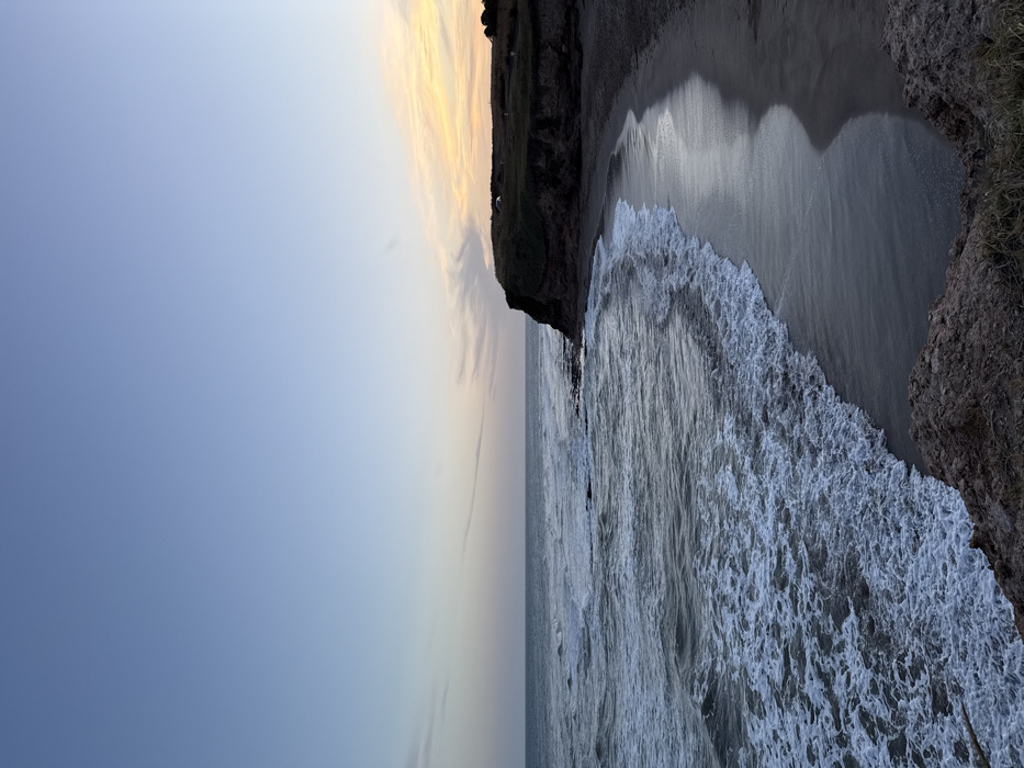 An ocean view framed by land on either side. Waves break on the beach. The sky transitions from blue to yellow, suggesting sunrise or sunset. A rocky cliff rises from the beach. Shadows indicate the scene is illuminated from the left. The image is rotated ninety degrees clockwise.