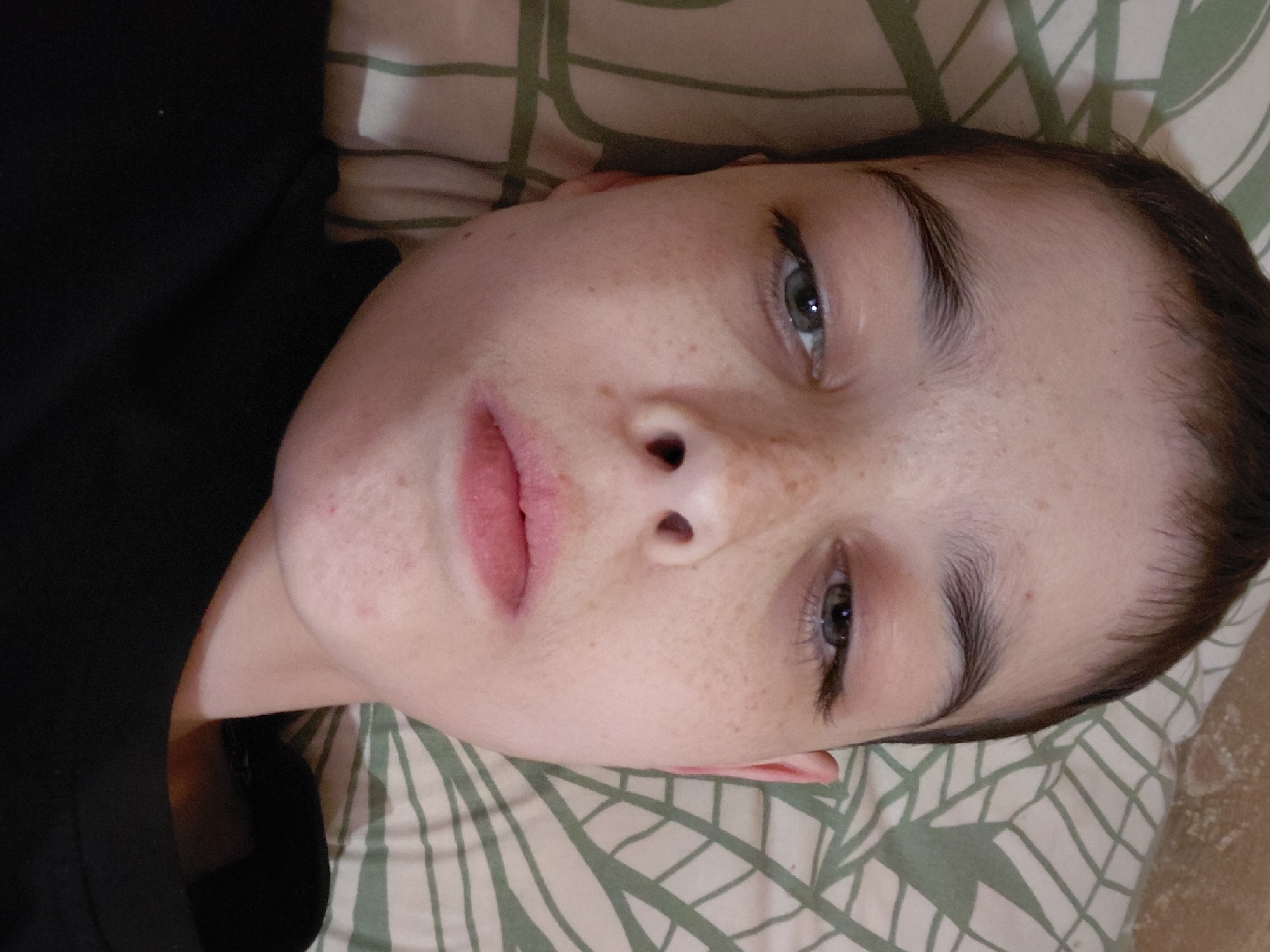 A close-up, rotated image shows a person lying down. The person has fair skin with freckles, light-colored eyes, and dark eyebrows. They are wearing a black top. The person is lying on a pillow with a green and white pattern. The location in Cherven Bryag, Bulgaria, is not discernible from the image.
