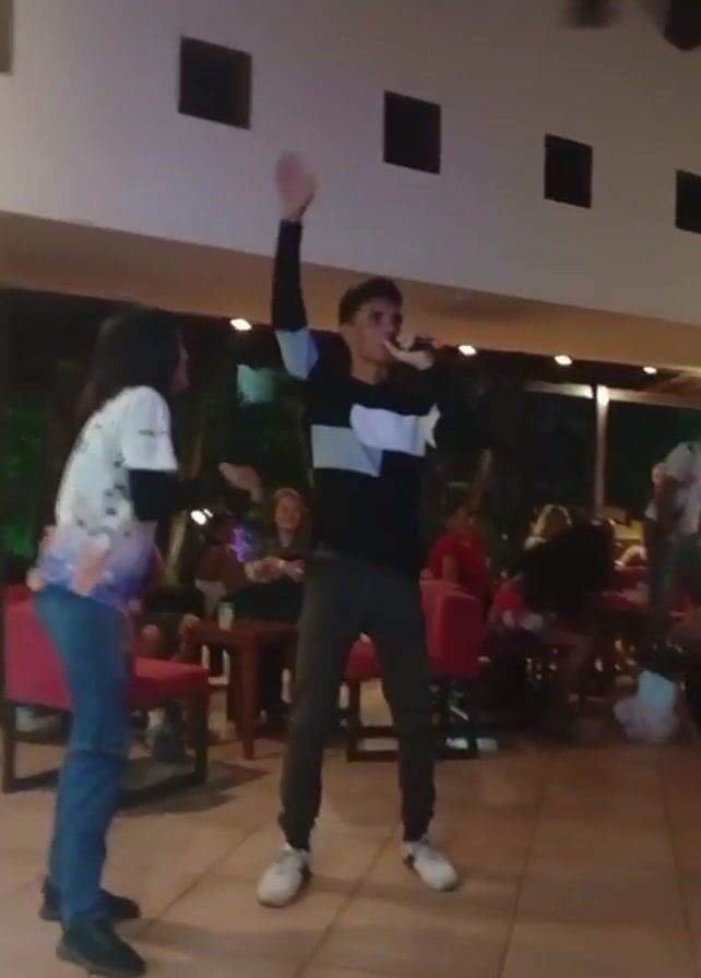 Here's a brief description of the video: A young man is singing into a microphone while a young woman dances alongside him. They appear to be performing in an indoor area, possibly a restaurant or event space, as there are tables and chairs with people seated in the background. The man is wearing a black and white striped shirt, dark pants, and white sneakers. The woman is wearing a light-colored shirt with a blue design, blue jeans, and black shoes. There are lights and a ceiling fan visible above them.