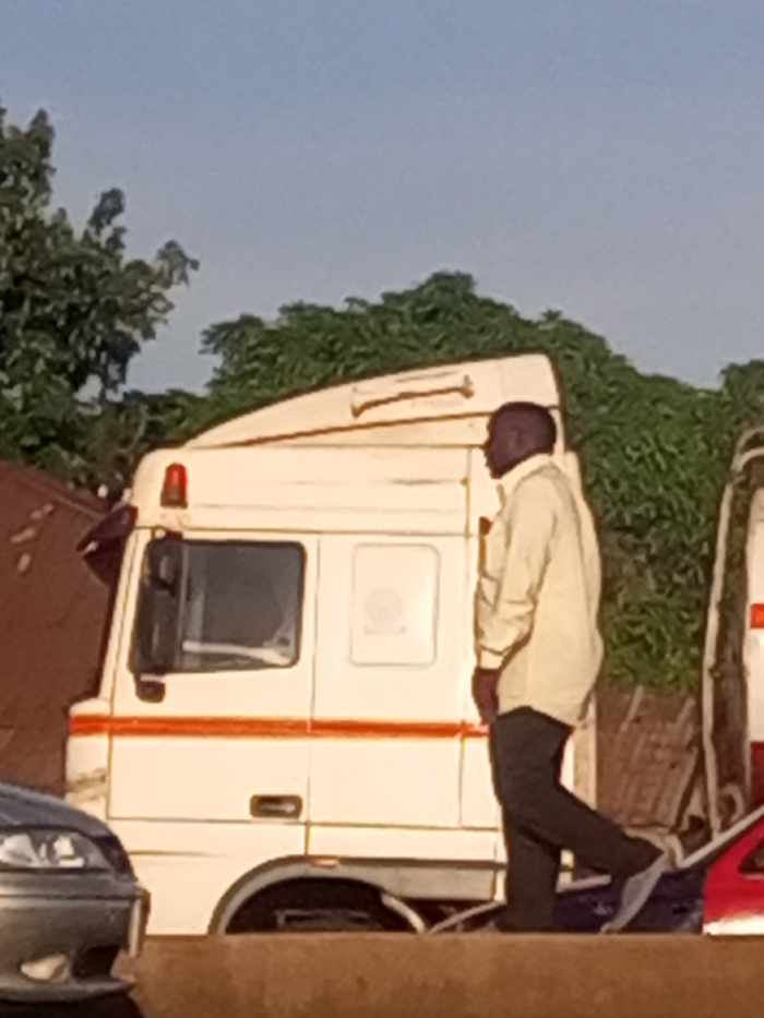 The image depicts an outdoor urban or roadside scene in Jos, Nigeria, under clear daylight conditions. In the mid-ground, a dark-skinned adult male is seen in profile, walking towards the right. He wears a light-colored long-sleeved shirt, dark trousers, and light-colored shoes. Behind him and extending to the left is the white cab of a truck, featuring a prominent horizontal orange stripe, a driver's side window, and a red indicator light on its roof. A faint circular emblem is visible on the truck's side panel. To the far right, a partial section of another white vehicle with an orange stripe is visible. In the lower-left foreground, the front bumper and headlight of a dark-colored sedan are visible. The background consists of dense green foliage under a clear light-blue sky. A reddish-brown roof structure is partially visible behind the left side of the truck. A low, brown concrete barrier runs across the bottom of the frame, separating the immediate foreground.