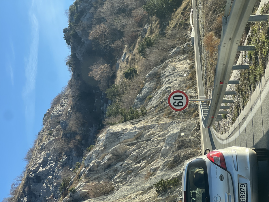 A daytime view shows a mountain road curving sharply. A silver car is positioned on the right side of the road, next to a guardrail. A circular speed limit sign displays the number "60" in red. The mountain face rises dramatically on the left, its rocky surface sparsely covered with trees. The sky is clear and blue.