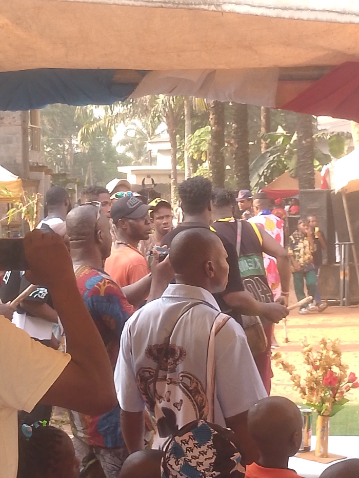 This image captures an outdoor gathering in Nnobi, Nigeria, beneath a makeshift canopy of white and blue fabric. A dense crowd, predominantly adult males, occupies the mid-ground, with many individuals facing generally towards the right side of the frame. Essential details include: * **People:** In the mid-left, a man with a shaved head wears a colorful patterned shirt. Next to him, a man in an orange t-shirt and black baseball cap looks right. Another man beside them holds a camera, aiming it towards the right. In the central mid-ground, an individual with dark, curly hair wears a black t-shirt with a neon green graphic. To their right, a person holds a drumstick, suggesting musical performance. In the immediate foreground, the back of a man wearing a light blue collared shirt with a prominent golden crown and butterfly design is visible; he also wears a light-colored shoulder bag. Partially visible children's heads are in the lower foreground. * **Objects:** The overhead canopy structure is visible at the top. On the far right, large black sound speakers are set up. A small floral arrangement, consisting of red and gold artificial flowers in a golden vase, rests on a table in the lower right foreground. * **Environment:** The background features numerous palm trees and other dense vegetation. Portions of residential buildings are visible between the trees. The sky appears bright, possibly hazy. The ground is unpaved, consistent with an outdoor, open-air setting. * **Actions/Interactions:** Individuals are standing, observing, and some are engaged in activities such as recording or performing music. No direct, explicit interactions between specific individuals are clearly discernible beyond being part of a gathering.