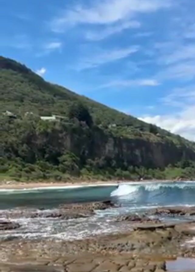 scenic coastal landscape. In the foreground, there is a rocky shoreline with various textures and small pools of water. The midground features waves rolling in towards a sandy beach. A verdant, tree-covered mountain dominates the background, with a few buildings visible along its slopes. The sky is blue with scattered white clouds, creating a bright and sunny atmosphere. The overall impression is that of a tranquil and beautiful natural environment.