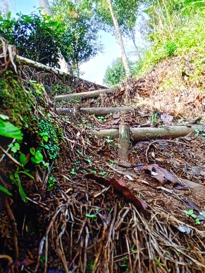 The image depicts a section of an upward-sloping outdoor pathway within the city of Taungpi, Myanmar (Burma). A series of approximately five rudimentary steps are visible, constructed from horizontally laid natural logs or tree branches, secured into the earth by vertical wooden stakes. The steps are unevenly spaced and appear weathered. The ground of the path is composed of dark brown soil, heavily interspersed with dry leaves, twigs, and other organic debris. Small patches of green vegetation, including moss, cling to the soil on the left embankment and are sparsely scattered along the path. The immediate foreground shows a dense accumulation of dry plant matter. In the background and upper sections of the image, a dense canopy of green trees and foliage is visible against a bright, hazy blue sky, indicating a wooded or forested environment. No individuals, animals, or explicit actions are present within the frame.
