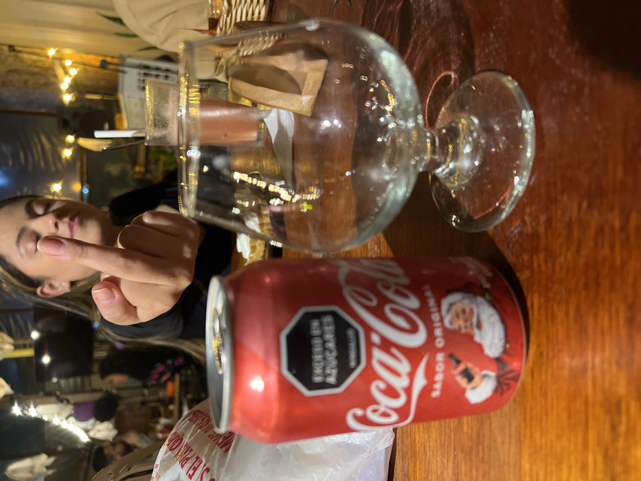 This image captures an indoor dining or social establishment, consistent with a restaurant or bar in Bogota, Colombia. The presence of the "EXCESO EN AZÚCARES" (Excess in Sugars) warning label in a black octagon on the Coca-Cola can is indicative of products sold in Colombia under its public health regulations. The ambient lighting suggests evening or nighttime. In the immediate foreground, on a dark wooden table, a red Coca-Cola can with a holiday-themed Santa Claus graphic and "SABOR ORIGINAL" text is positioned upright. To its right, an empty, clear brandy snifter-style glass rests on the table. A white plastic bag is partially visible to the left of the can. In the mid-ground, a female subject with long, light-brown hair, wearing dark clothing, is visible in soft focus. Her left hand is raised, with the middle finger extended towards the camera, a gesture of offense. Her face is indistinct, with eyes appearing partially closed or cast downwards due to the shallow depth of field. The background shows additional blurred patrons seated at various tables. String lights create a bokeh effect, illuminating the space. Other discernible background elements include a partially visible television screen, a light-colored beverage in a glass with a straw, a white dessert item on a plate, and a woven basket on a table surface. No other direct interactions are clearly observable.