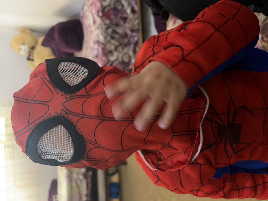 - "The image displays an individual, likely a child, dressed in a red and blue full-body Spider-Man costume, standing in an indoor residential setting in Dar Bouazza, Morocco" by FM-dXKAk1, licensed under CC BY 4.0