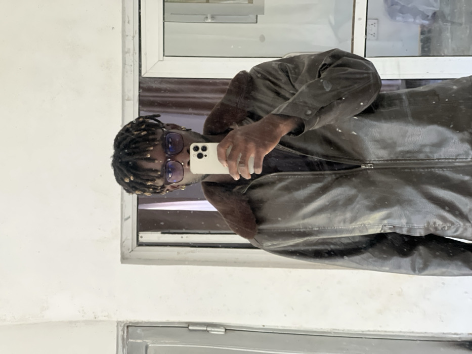 A dark-skinned individual with dreadlocks, eyeglasses with dark frames and blue-tinted lenses, a nose stud, and gold hoop earrings is depicted in a mirror selfie. The person wears a dark brown, leather-like jacket with a prominent dark brown, possibly faux-fur, collar over a dark, partially unzipped shirt. They hold a light-colored smartphone with a multi-lens camera array in their right hand, positioning it for the photograph. The scene is an indoor mirror selfie taken in Sabon Tasha, Nigeria. The background visible in the reflection includes an off-white wall showing minor wear and some visible specks on the mirror surface. To the left, a metallic-framed section, possibly a door, with a visible hinge, is present. To the right, a white-framed glass panel, consistent with a door or window, reflects a brown curtain and two white electrical outlets mounted on a dark surface.