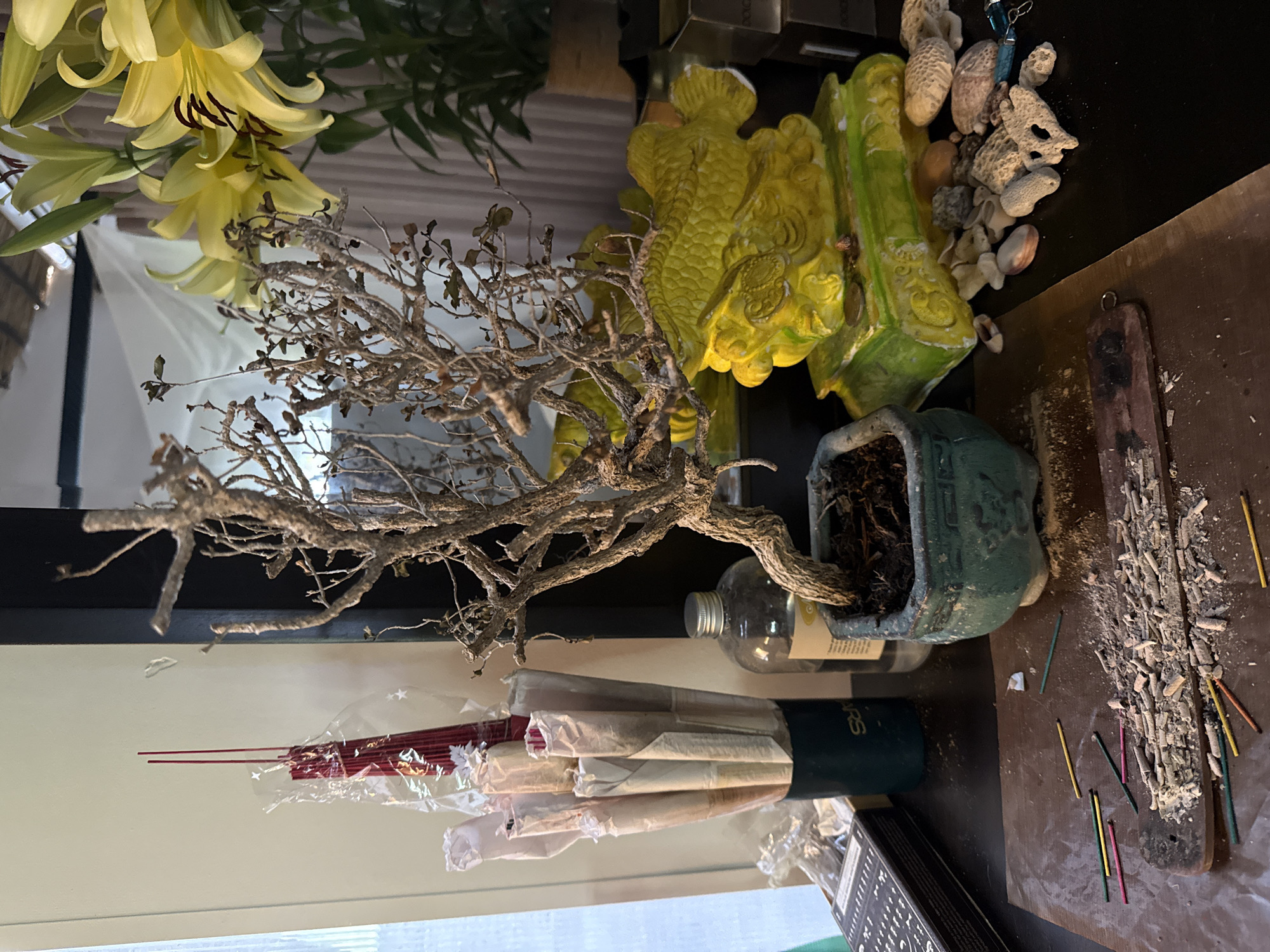 The image depicts a tabletop still life. Dominating the scene is a bonsai tree in a green, square pot. Next to the pot is a small glass bottle. Adjacent to the bonsai tree are several ornate, greenish-yellow figures. Scattered around these objects are various seashells and what appears to be incense ash and burned incense sticks of various colors. In the foreground, partially obscured, are packaged incense sticks in a white wrapper with red sticks visible. Part of a closed black box is visible in the bottom left of the frame. In the background, there are partially visible yellow flowers. The environment appears to be an indoor setting. There's no clear evidence or direct mention to confirm the location is Nha Trang, Vietnam, but if there is further information on the image, it may be assumed from the objects in the setting and the plants grown.