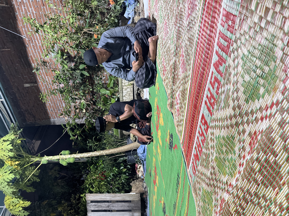 The image displays an outdoor nighttime scene in Lhokseumawe, Indonesia. Two adult males are seated cross-legged on woven mats. The male on the left, positioned on a green mat with yellow and red patterns, wears a black peci, a black short-sleeved shirt, and a brown/black patterned sarong. His left hand is raised to his left ear, while his right hand holds a white cigarette. A wristwatch is visible on his left wrist. The male on the right, seated on a red, green, and white patterned mat with visible text, wears a black peci, a grey long-sleeved shirt, and a grey/black patterned sarong. He holds a black smartphone with both hands, looking down at the screen. The background features a red brick wall partially covered by various green plants. A tall papaya tree bearing green fruit stands prominently on the left. A wooden fence or panel is visible on the far left. Other objects in the background include sandals, blue fabric, and planters. Artificial light illuminates the scene from an unseen source.