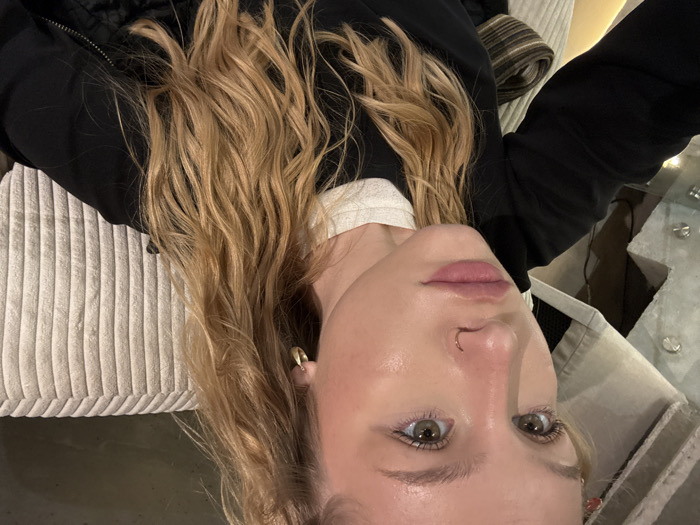 A selfie-style shot features a woman with wavy blonde hair and fair skin. She has green eyes and a nose ring. She's wearing a black jacket over a white top. The background shows a cream-colored, ridged sofa and a glass table with silver decorations. The image is rotated, positioning her head at the bottom of the frame. The overall scene is casual and intimate.