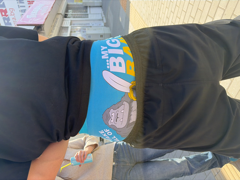 The image presents an outdoor scene on Simeonovko Shose Street in Sofia, Bulgaria, under bright daylight. The primary subject is a person viewed from behind, wearing a black short-sleeved t-shirt and loose-fitting black track pants. The waistband of bright blue underwear is prominently visible above the track pants, featuring a cartoon gorilla, a banana, and partial text that reads "TAKE ALL OF... MY BIG BA[NA]NA". To the left and slightly behind this individual, a second person is partially visible, wearing a light-colored long-sleeved top and blue jeans, holding a light blue can with a yellow straw in their right hand. The background features a building with multiple storefronts; visible signage includes "erra.bg" and "Пекарна" (Bakery), along with a street sign indicating "УЛ. СИМЕОНОВСКО ШОСЕ" (Simeonovko Shose Street). The ground consists of light-colored paving stones.