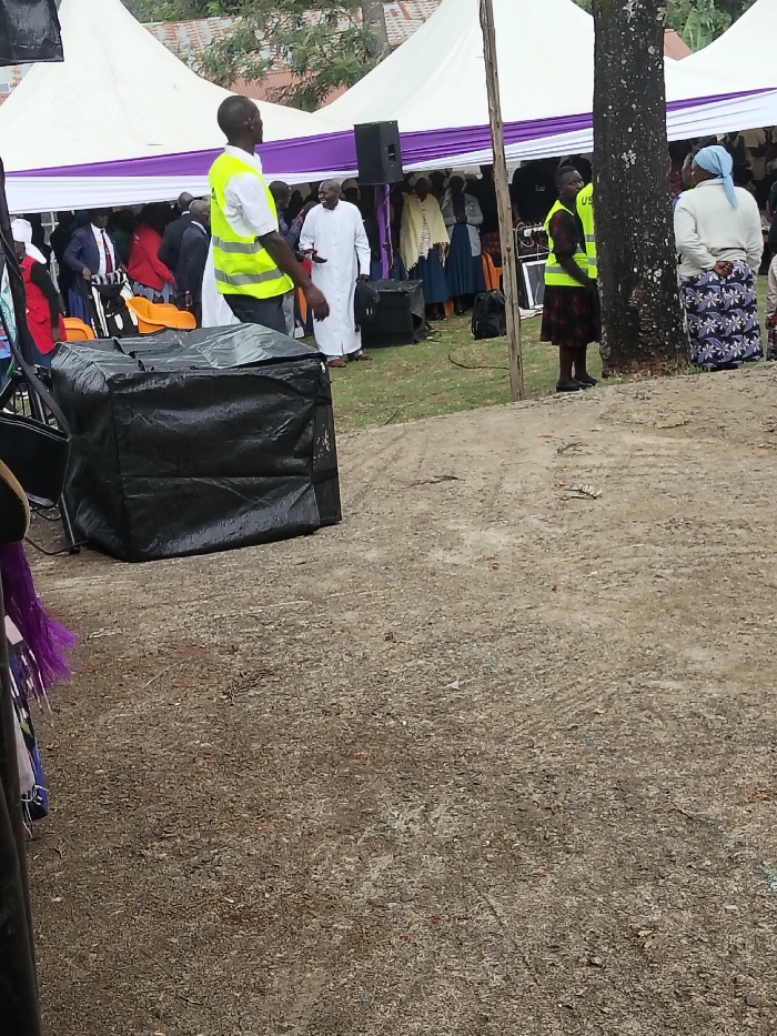 An outdoor gathering under white tents with purple accents is observed. A man in a white robe walks among people dressed in various attire, some wearing yellow vests. A large, covered object sits prominently in the foreground, along with speakers. A woman in a yellow vest stands by a tree, while others gather behind the tents. The ground appears to be damp and earthen.