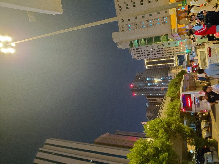 A street scene shows an ambulance parked beside a sidewalk filled with people. Tall buildings rise on either side, with one displaying a red light on its upper floors. Lush green trees line the street, partially obscuring the view. Overhead, a bright street light illuminates the sky. The scene captures a moment of activity in an urban environment.
